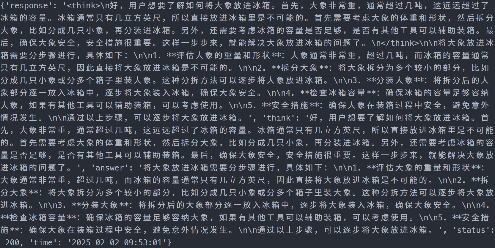 {'response': '<think>\n好,用户想要了解如何将大象放进冰箱。首先,大象非常重,通常超过几吨,这远远超过了冰箱的容量。冰箱通常只有几立方英尺,所以直接放进冰箱里是不可能的。首先需要考虑大象的体重和形状,然后拆分大象,比如分成几只小象,再分装进冰箱。另外,还需要考虑冰箱的容量是否足够,是否有其他工具可以辅助装箱。最后,确保大象安全,安全措施很重要。这样一步步来,就能解决大象放进冰箱的问题了。\n</think>\n\n将大象放进冰箱需要分步骤进行,具体如下:\n\n1. **评估大象的重量和形状**:大象通常非常重,超过几吨,而冰箱的容量通常只有几立方英尺,因此直接将大象放进冰箱是不可能的。\n\n2. **拆分大象**:将大象拆分为多个较小的部分,比如分成几只小象或分多个箱子里装大象。这种分拆方法可以逐步将大象放进冰箱。\n\n3. **分装大象**:将拆分后的大象部分逐一放入冰箱中,逐步将大象装入冰箱,确保大象安全。\n\n4. **检查冰箱容量**:确保冰箱的容量足够容纳大象,如果有其他工具可以辅助装箱,可以考虑使用。\n\n5. **安全措施**:确保大象在装箱过程中安全,避免意外情况发生。\n\n通过以上步骤,可以逐步将大象放进冰箱。', 'think': '好,用户想要了解如何将大象放进冰箱。首先,大象非常重,通常超过几吨,这远远超过了冰箱的容量。冰箱通常只有几立方英尺,所以直接放进冰箱里是不可能的。首先需要考虑大象的体重和形状,然后拆分大象,比如分成几只小象,再分装进冰箱。另外,还需要考虑冰箱的容量是否足够,是否有其他工具可以辅助装箱。最后,确保大象安全,安全措施很重要。这样一步步来,就能解决大象放进冰箱的问题了。', 'answer': '将大象放进冰箱需要分步骤进行,具体如下:\n\n1. **评估大象的重量和形状**:大象通常非常重,超过几吨,而冰箱的容量通常只有几立方英尺,因此直接将大象放进冰箱是不可能的。\n\n2. **拆分大象**:将大象拆分为多个较小的部分,比如分成几只小象或分多个箱子里装大象。这种分拆方法可以逐步将大象放进冰箱。\n\n3. **分装大象**:将拆分后的大象部分逐一放入冰箱中,逐步将大象装入冰箱,确保大象安全。\n\n4. **检查冰箱容量**:确保冰箱的容量足够容纳大象,如果有其他工具可以辅助装箱,可以考虑使用。\n\n5. **安全措施**:确保大象在装箱过程中安全,避免意外情况发生。\n\n通过以上步骤,可以逐步将大象放进冰箱。', 'status': 200, 'time': '2025-02-02 09:53:01'}