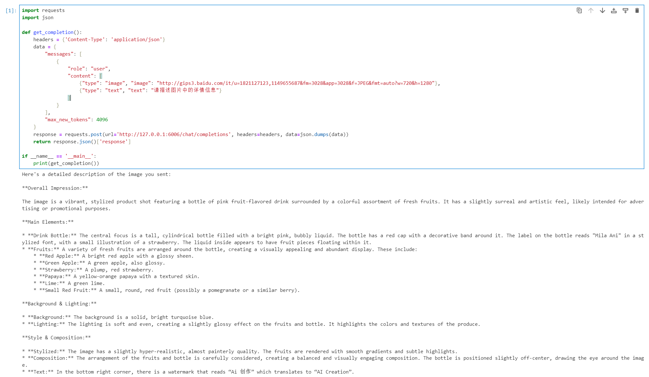 -d '{"messages": [{"role": "user","content": [{"type": "image", "image": "http://gips3.baidu.com/it/u=1821127123,1149655687&fm=3028&app=3028&f=JPEG&fmt=auto?w=720&h=1280"},{"type": "text", "text": "请描述图片中的详情信息"}]}],"max_new_tokens": 4096}'也可以使用 python 中的 requests 库进行调用,如下所示: