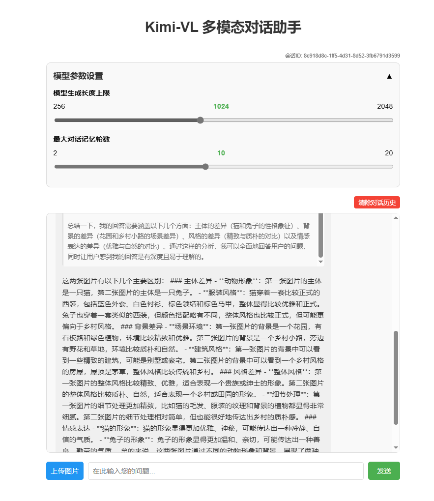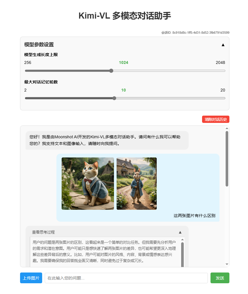 本次教程搭建了一个基于 Kimi-VL-A3B-Thinking 的前后端分离的对话助手,额外提供了参考代码供学习者参考