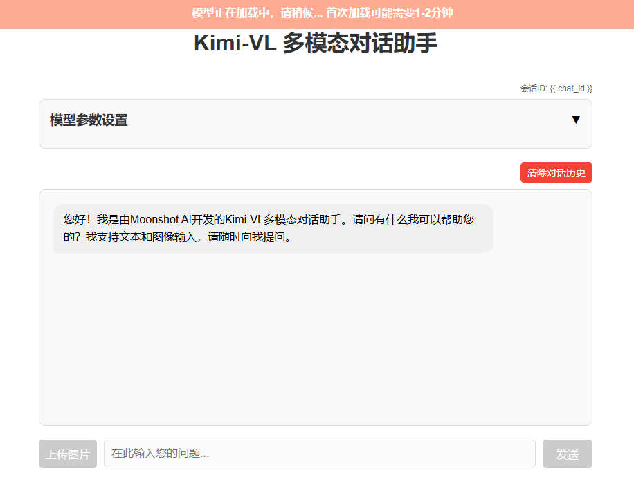 注意:启动后模型会在后台自动加载,这可能需要1-2分钟。在此期间,界面会显示"模型正在加载中"的提示,加载完成后才能开始对话。