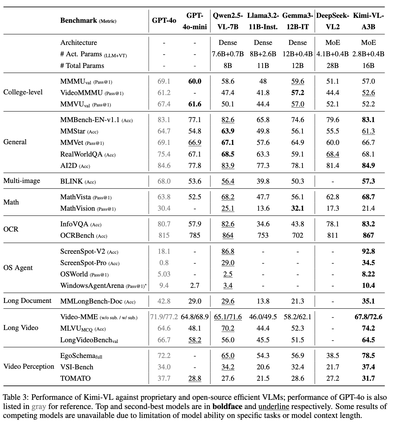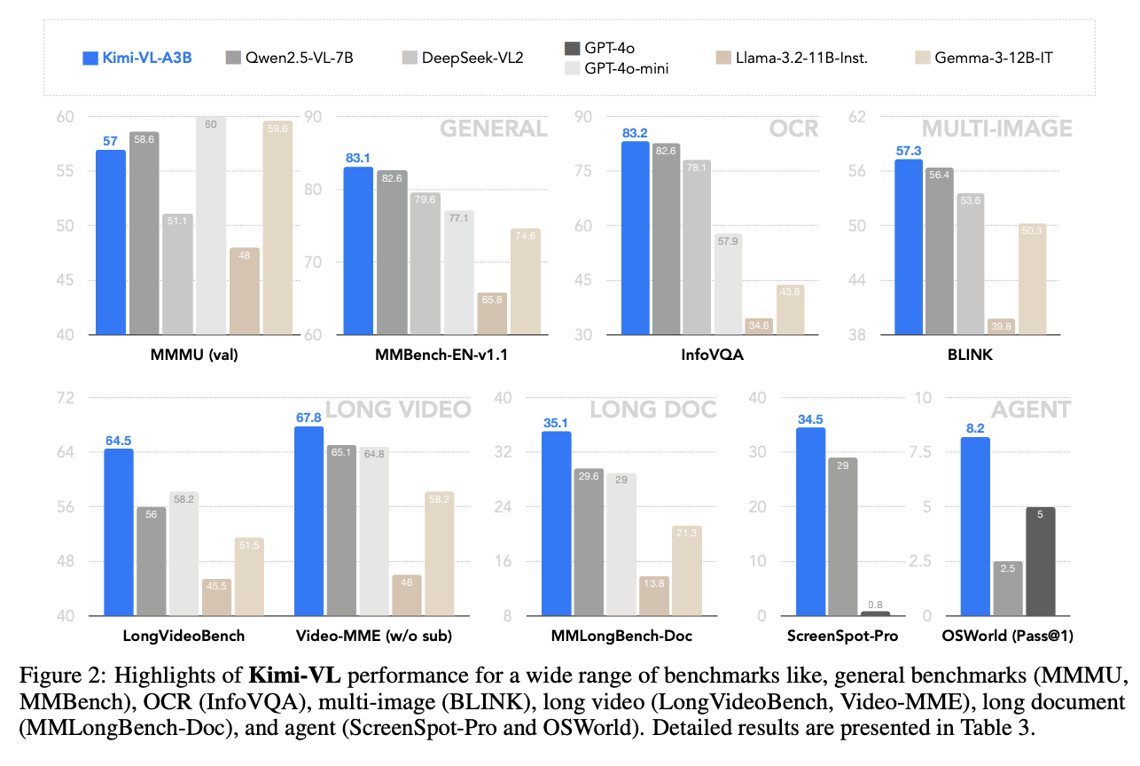 Kimi-VL在InfoVQA、MathVista、LongVideoBench、OSWord、ScreenSpot、WindowsAgentArena、MMLongBench、Video-MME 、EgoSchema、 VSI-Bench等权威基准测试中表现出色,以超越了GPT-4o、Qwen2.5-VL、DeepSeek-VL2等模型。