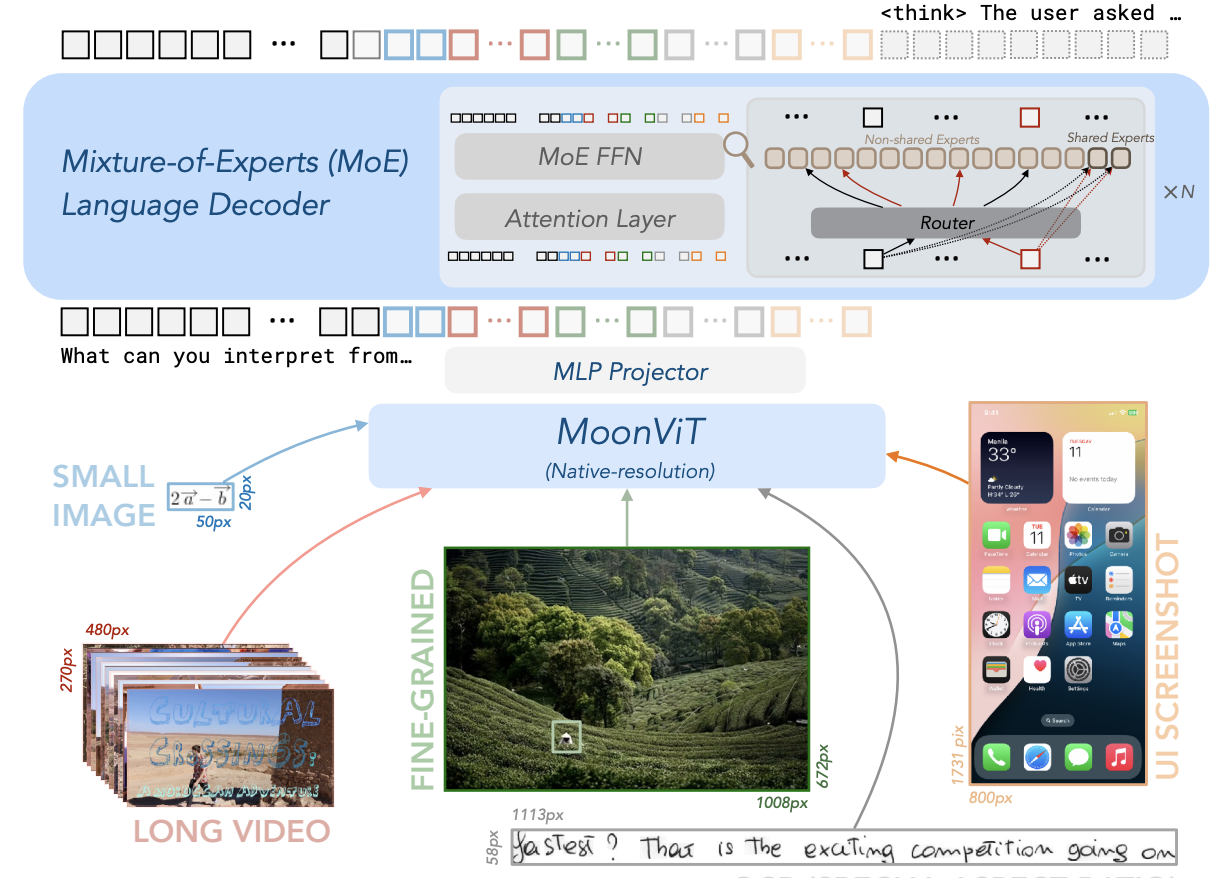 - MoE语言解码器(Moonlight): 基于月之暗面自主研发的Moonlight模型,使用Mixture-of-Experts架构,实现仅2.8B激活参数即可达到较大模型的性能水平。