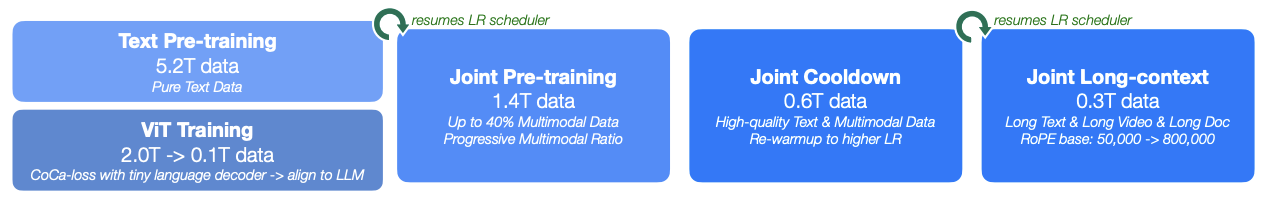 - 联合预训练阶段: 在此阶段,加载了已完成纯文本预训练的MoE语言模型(Moonlight),并与视觉编码器MoonViT进行联合训练,使用1.4T tokens的混合数据(文本+图文),采用逐步增加图文比例的方式,确保语言能力不被弱化。