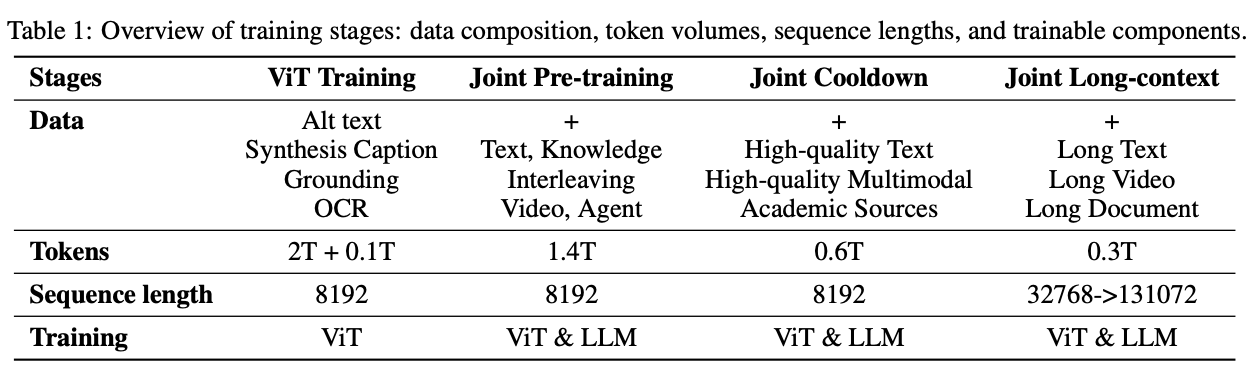 | OCR数据 | 包含公开OCR数据集与大规模内部采集数据,涵盖手写、自然图景、扫描文档等;应用图像增强技术(旋转、加噪、变形)以增强鲁棒性,并通过OCR 2.0策略扩展图表、表格识别能力。 | 数百万样本 | 提升模型识别多样化视觉文本(文字、排版、结构等)的能力 |