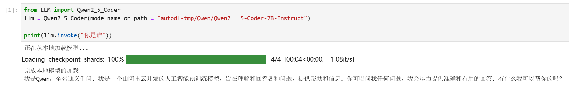 model_dir = snapshot_download('Qwen/Qwen2.5-Coder-7B-Instruct', cache_dir='/root/autodl-tmp', revision='master')注意:记得修改