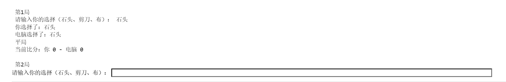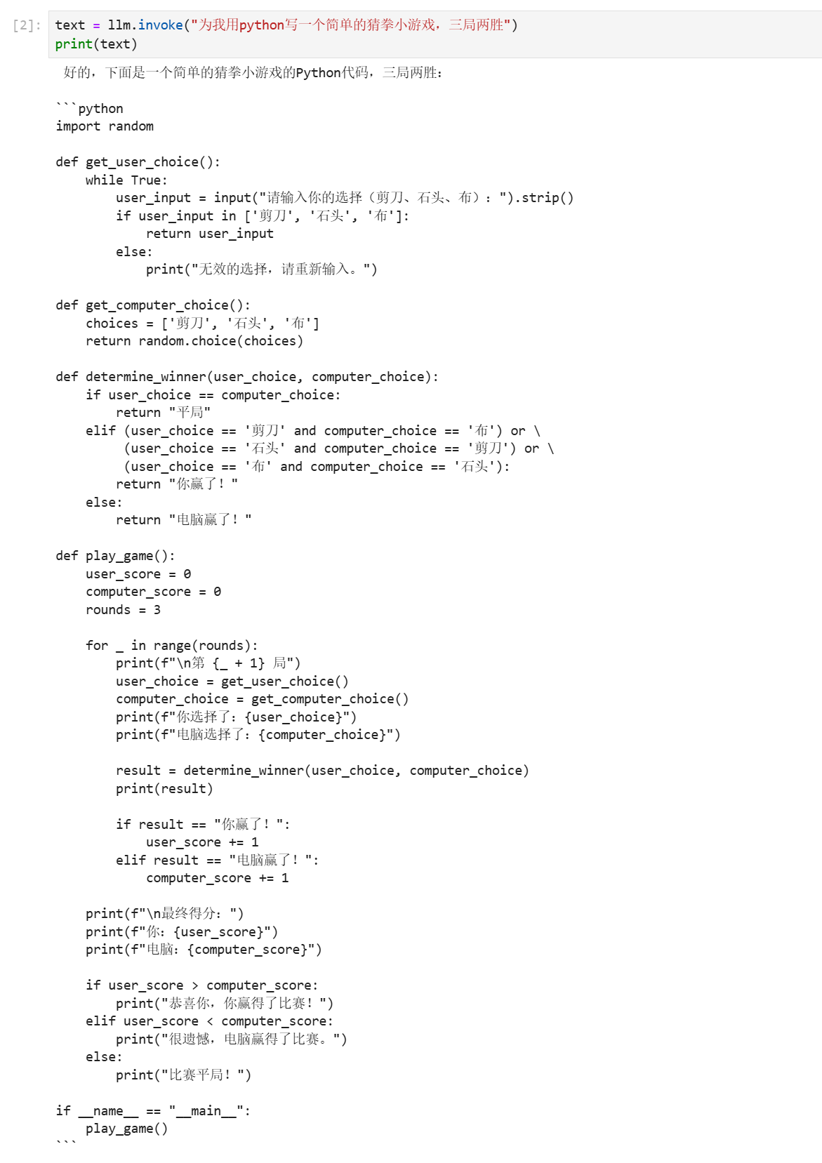text = llm.invoke("为我用python写一个简单的猜拳小游戏,三局两胜")