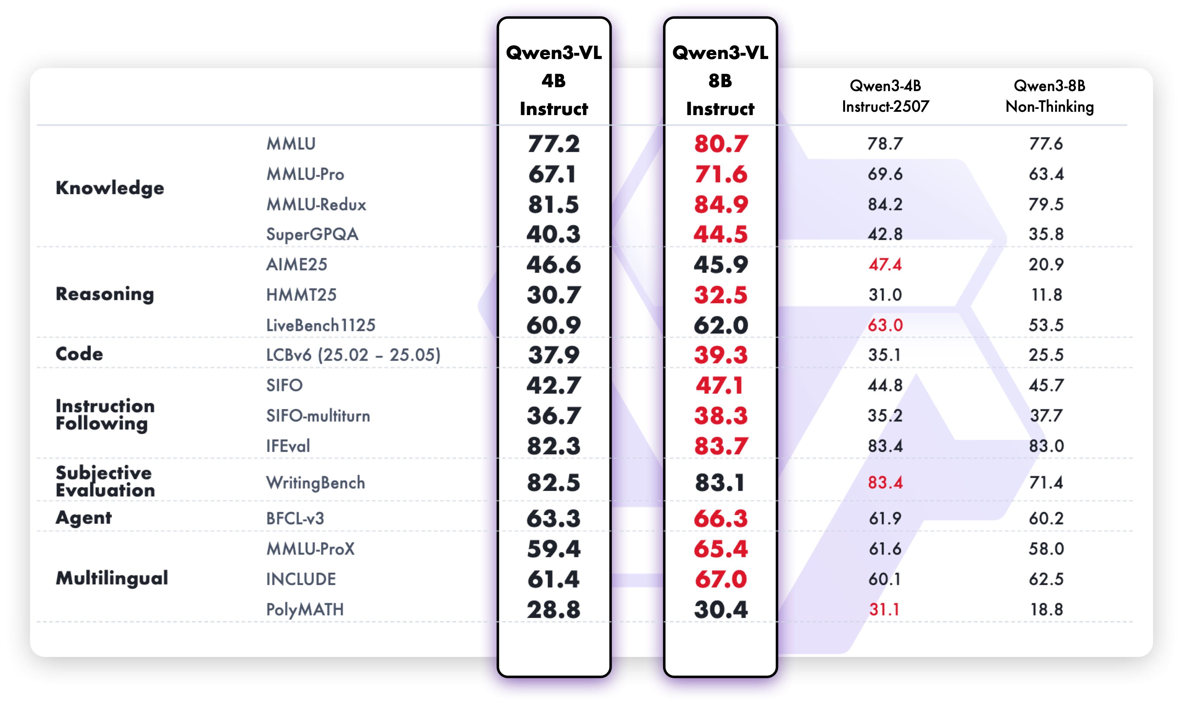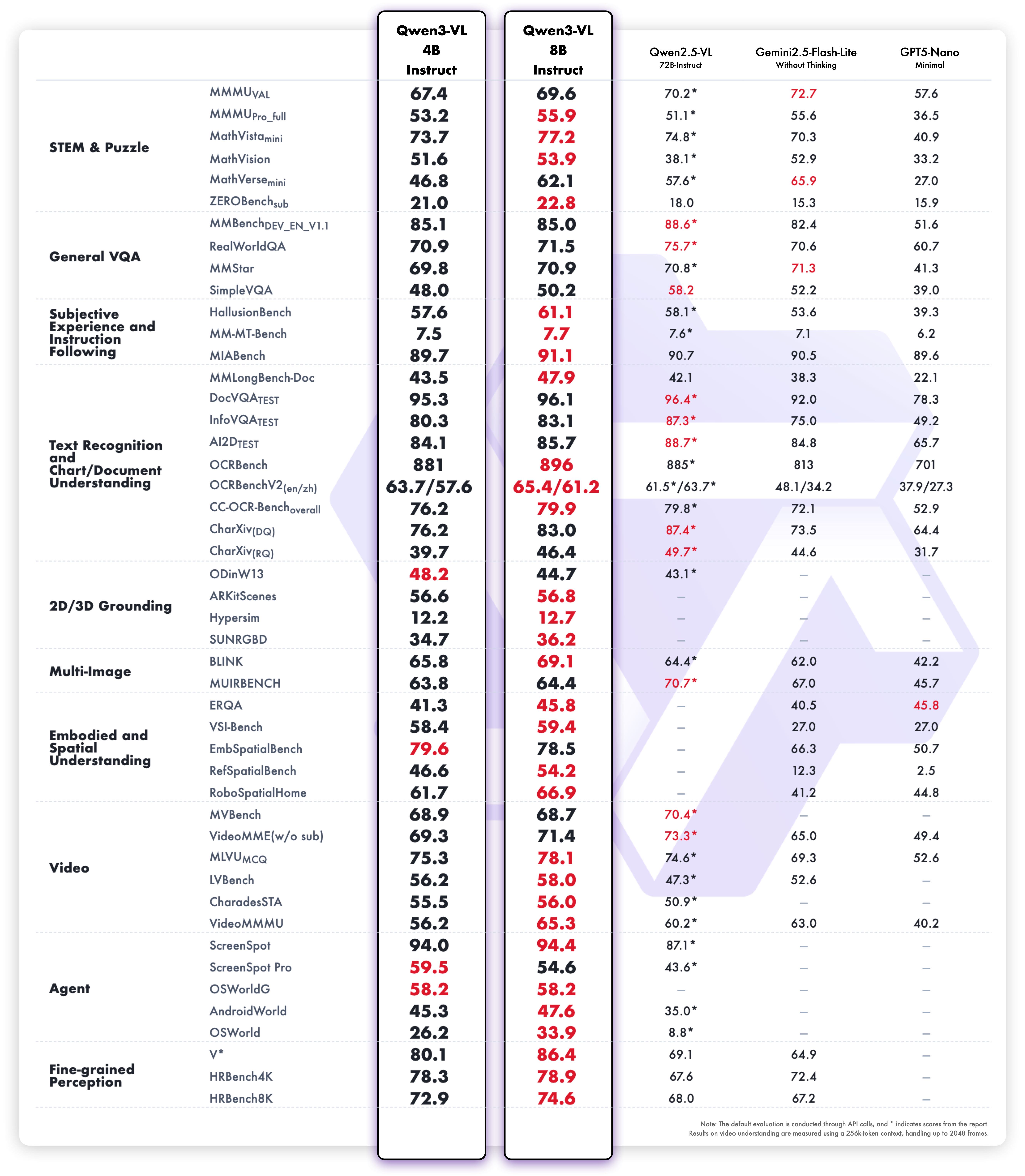 Qwen3-VL-4B-Instruct 是Qwen3-VL系列中的视觉语言模型,有着优秀的文本理解和生成能力、视觉感知和推理能力以及空间和视频动态理解能力。 评测结果表明,该模型在STEM、VQA、OCR、视频理解、智能体等多个任务中与GPT-5-Mini和Cluade-4-Sonnet相媲美。 另外,该模型是非推理模型,如果想要体验更强且带有thinking mode的模型,可以下载同尺寸的Qwen3-VL-30B-A3B-Thinking或者更大的旗舰模型Qwen3-VL-235B-A22B-Thinking。