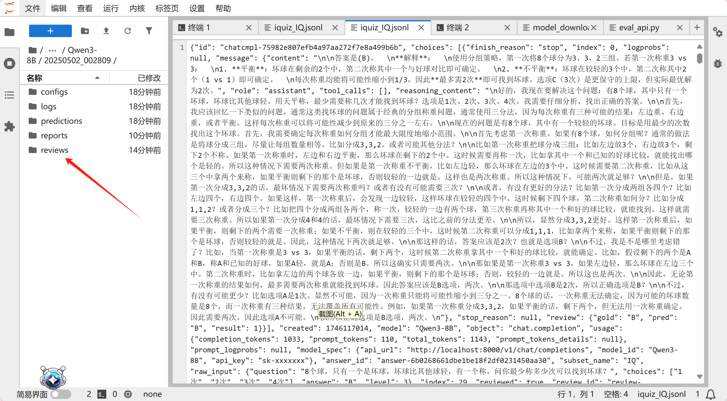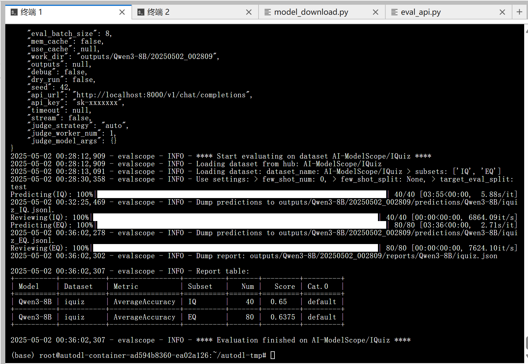 实验结果可能有误差,因为在评测任务配置中我们把 temperature 调到了 1.0,如果调小一些,可能会得到更精确的结果。 可以看到模型的得分还是不错的,模型评测的文件保存在/root/autodl-tmp/outputs/Qwen3-8B/20250502_002809/reviews/Qwen3-8B目录下。