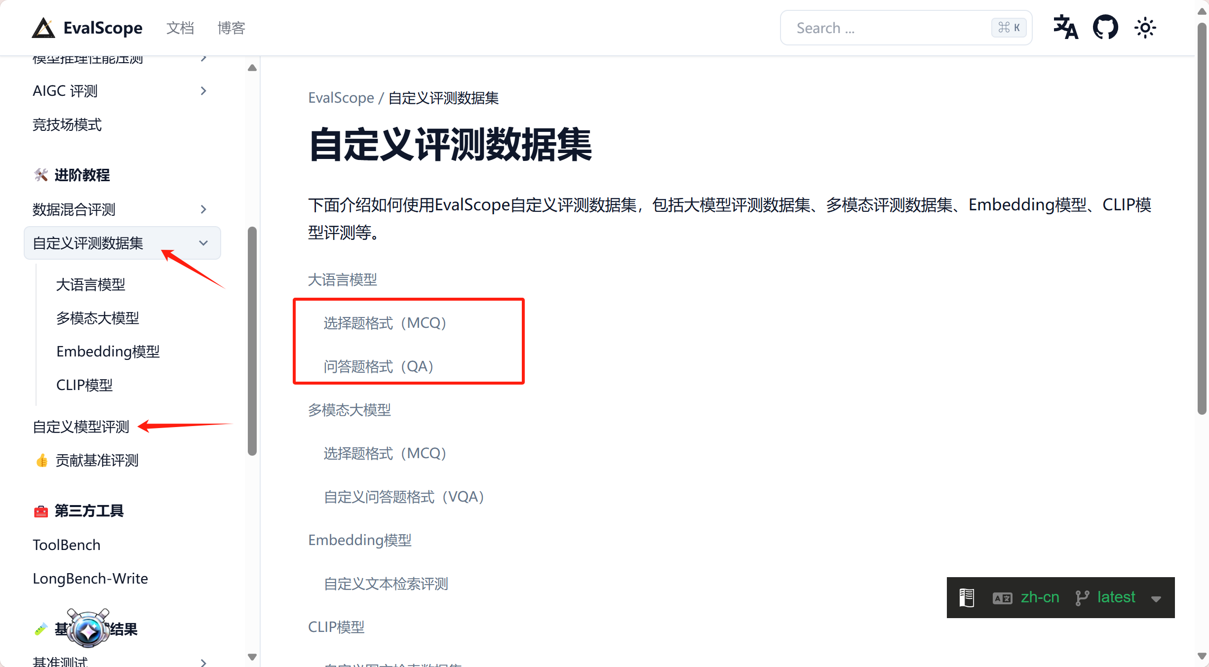 - EvalScope 也支持自定义评测任务和数据集,支持多种评测指标。
