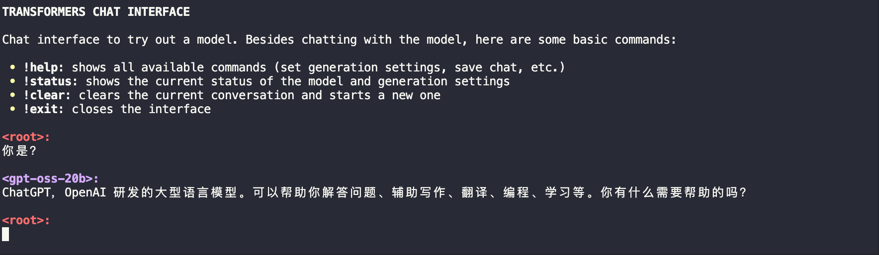 transformers chat localhost:8000 --model-name-or-path openai/gpt-oss-20bps:记得修改为你的模型下载路径哦~